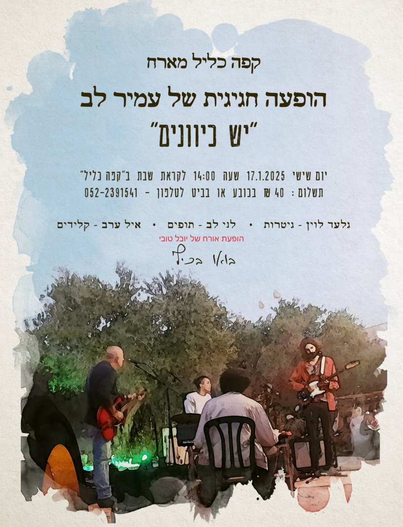 הופעה מיוחדת של עמיר לב בקפה כליל ביום שישי 17.1.25 לקראת שבת. "יש כיוונים"