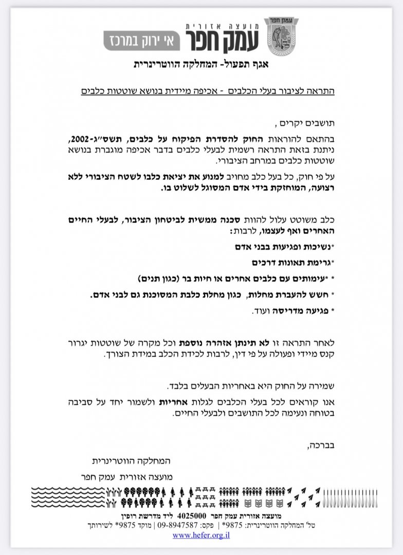 התראה לציבור בעלי הכלבים - אכיפה מיידית בנושא שוטטות כלבים
