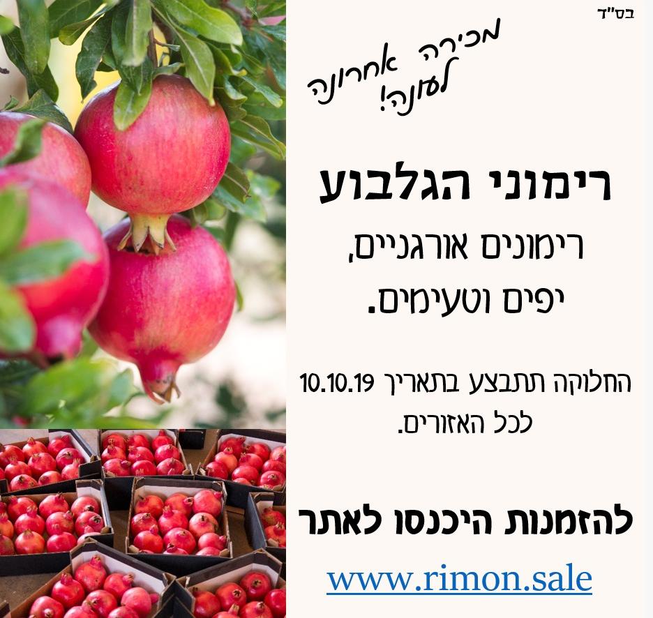 רימוני הגלבוע הם רימונים אורגניים שמשפחת צוקר מגדלת בהרי הגלבוע, הרימונים מגיעים אליכם לא יותר משבוע מאז שנקטפו ולפעמים ממש יום אחרי.