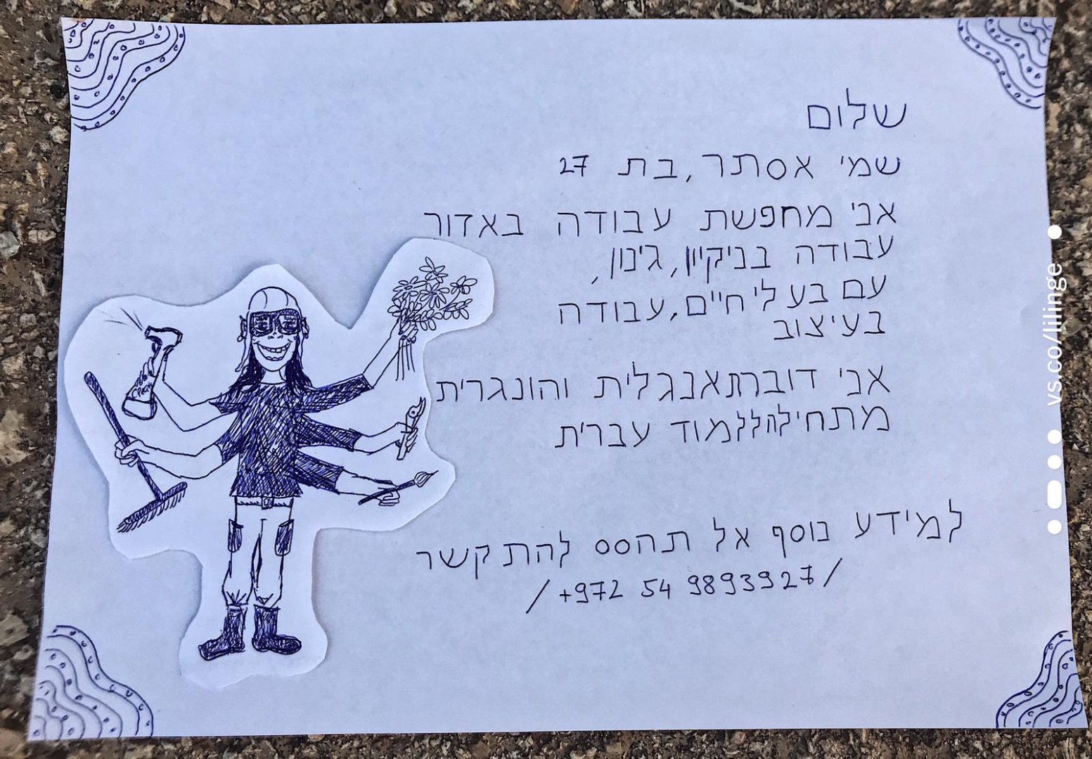 שמי אסתר, אני בת 27, גרתי ועבדתי בחווה האורגנית, בשנה וחצי האחרונות. אני יוצאת לדרך חדשה, ואני רוצה להשאר במושב או בעמק. אני דוברת הונגרית ואנגלית, וקצת עברית (מתכוונת להתחיל אולפן בקרוב).0549893927