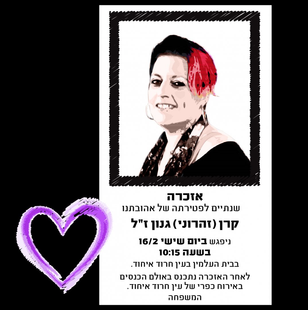 הזמנה לאזכרה, יום שישי הקרוב 16/2, שנתיים ללכתה של קרן זהרוני גנון ז"ל