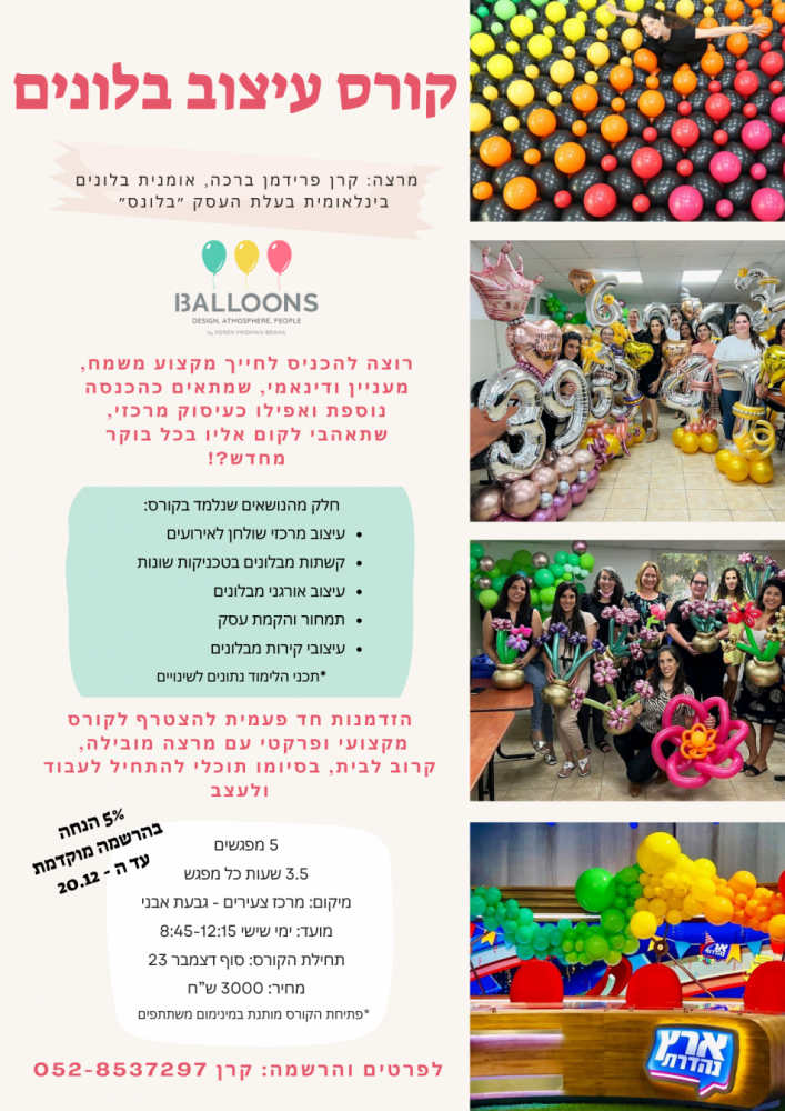 מרצה: קרן פרידמן ברכה, אומנית בלונים בינלאומית ובעלת העסק ״בלונס״